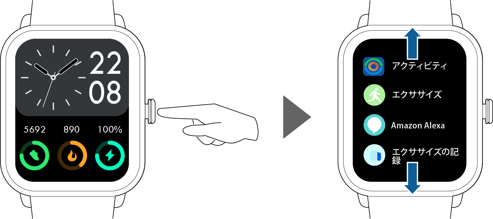 ホーム画面で機能ボタンを短押し:各種アプリと設定を表示します。上または下にスワイプしてアイコンを選択します。