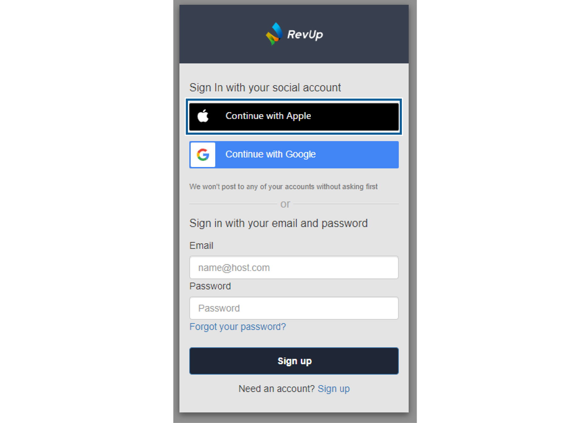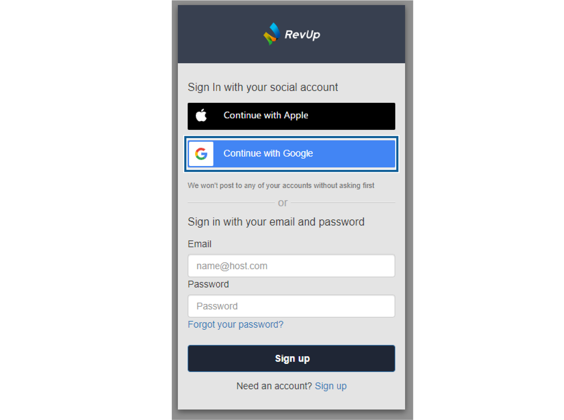:RevUpに登録済みのメールアドレスを入力します。