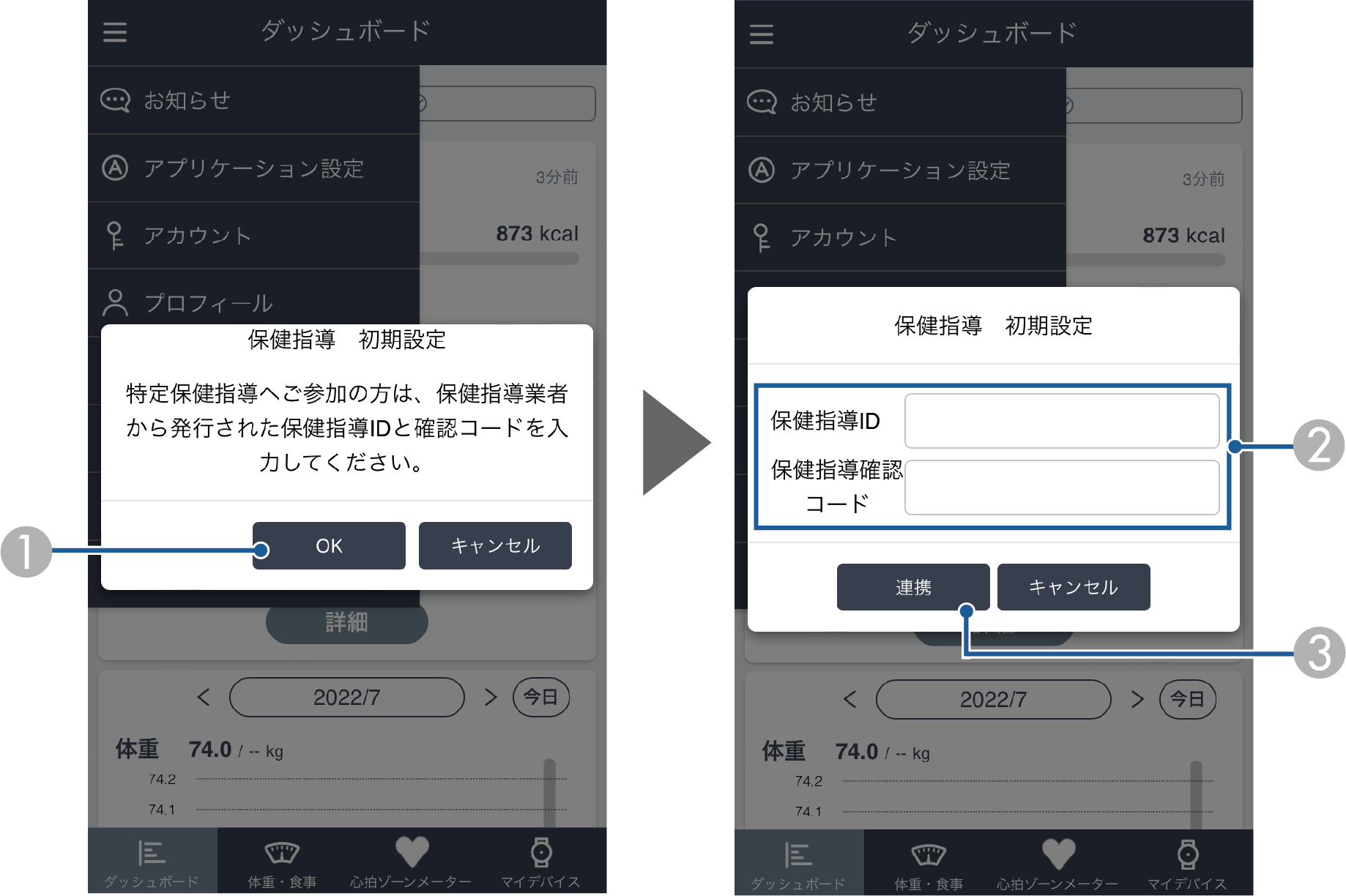 2. 保健指導 初期設定画面が表示されたら、画面の案内に従って保健指導業者から発行された保健指導IDと保健指導確認コードを入力します。