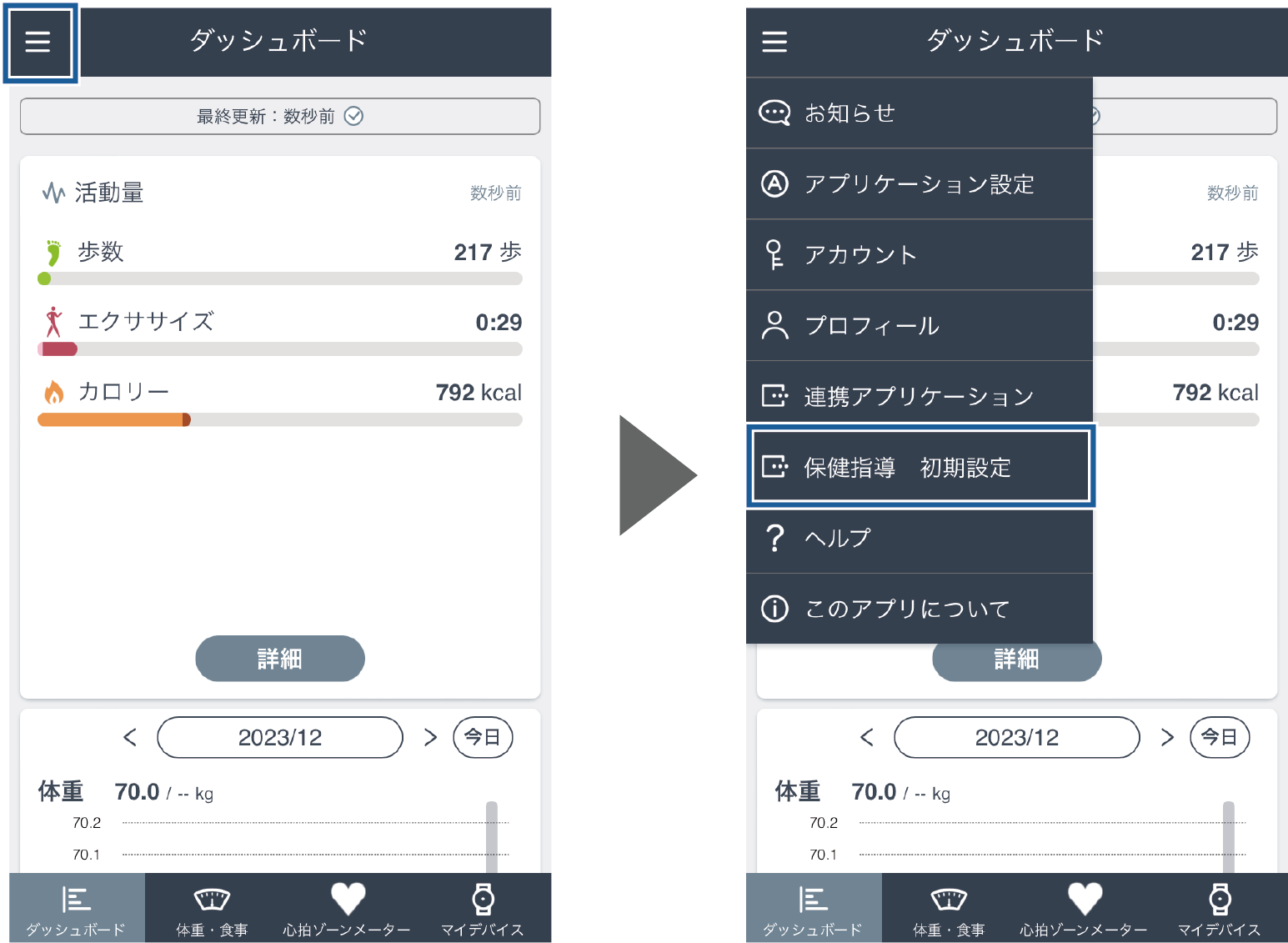 1. RevUpアプリのダッシュボード画面で、 > [保健指導 初期設定]の順にタップします。